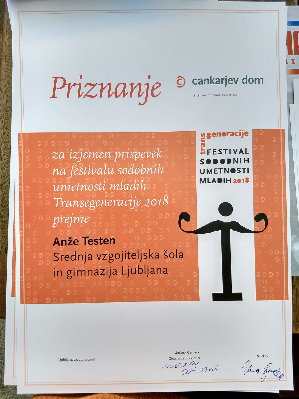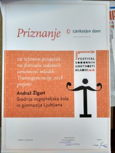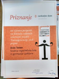 Na 20. Festival slovenskega filma so se v sklop Podmladek poleg omenjenega filma uvrstili še trije filmi naših trenutnih in bivših dijakov: “Nočna ptica”, Andraž Žigart (4.G), “…IN!?”, Jakob Grižonič (1.G) in “Še enkrat”, Urh Mlakar (4.G, 2015/2016).